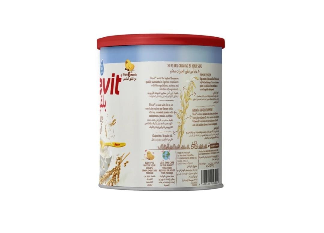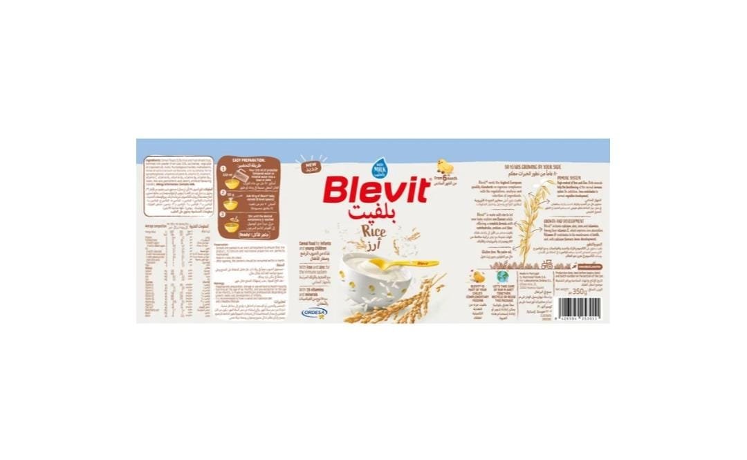 Ingredients of Blevit Rice With Milk: Rice (100%), Cow’s milk, Fructooligosaccharides (Prebiotics), Vitamins and Minerals.
