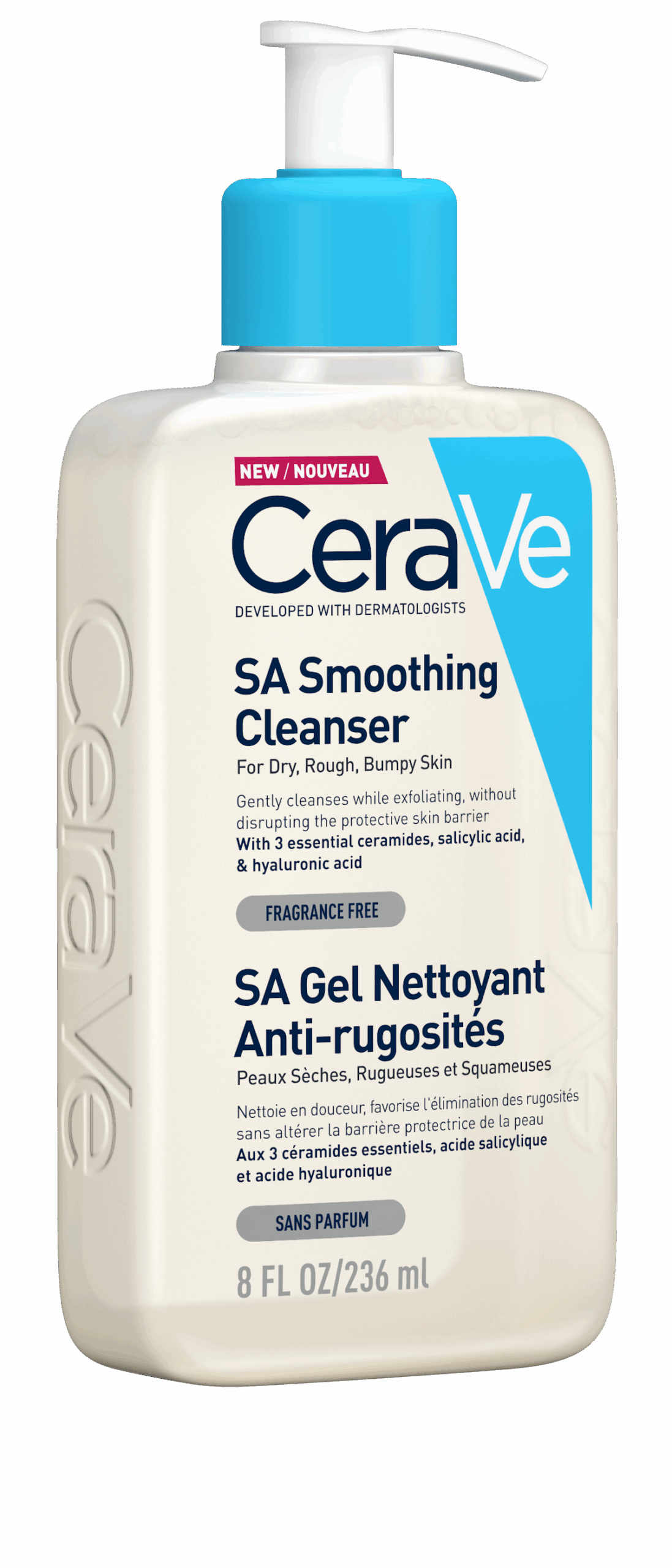 Cerave SA Smoothing Cleanser: Gently exfoliates and smooths skin, removes dirt and oil, and moisturizes. For normal to rough skin.