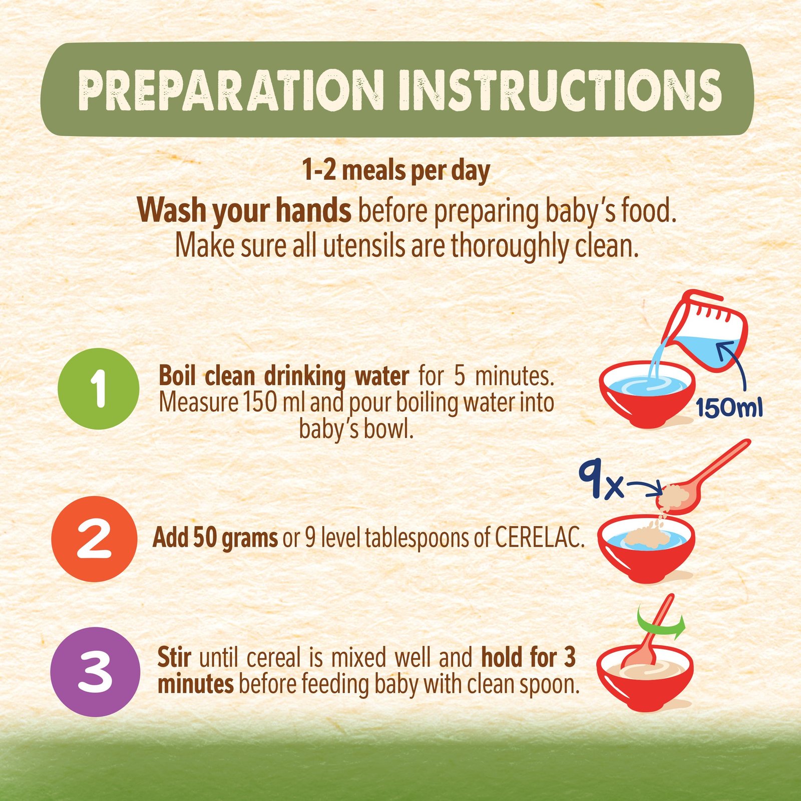 Usage Instructions for Cerelac Baby Cereal Wheat & Fruit Pieces 400g: