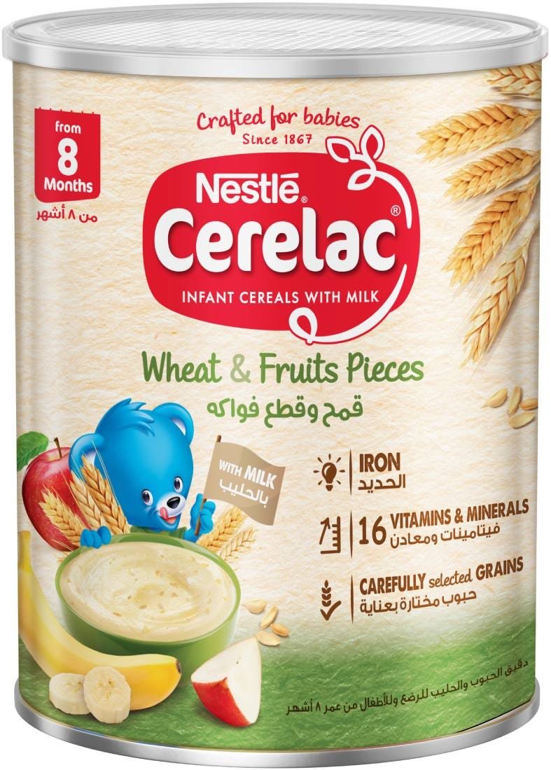 Cerelac Wheat & Fruit Pieces: Complete nutrition for babies 8+ months. Fortified with iron+ & nutrients for immunity and development.