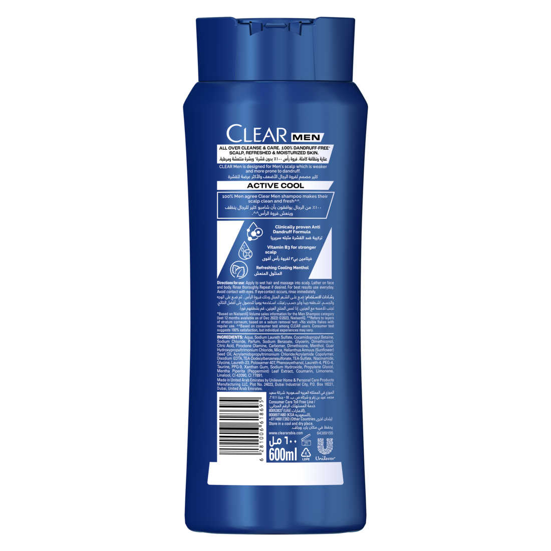 Experience complete refreshment with Clear Active Cool 3in1 Shampoo & Body Wash. Specially formulated for men, this all-in-one product offers superior care for your hair, scalp, and skin. Its unique formula with Cool Menthol provides a deep sense of refreshment, effectively combats dandruff, and cleanses and moisturizes your face and body. Say goodbye to daily environmental stressors like dirt and pollution that cause greasiness and itchiness.