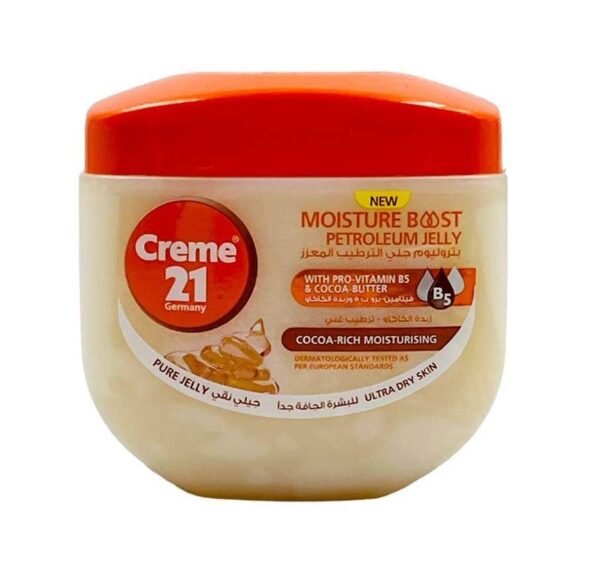 Deeply moisturize dry skin with Creme 21 Cocoa Butter Petroleum Jelly. Long-lasting softness and protection.