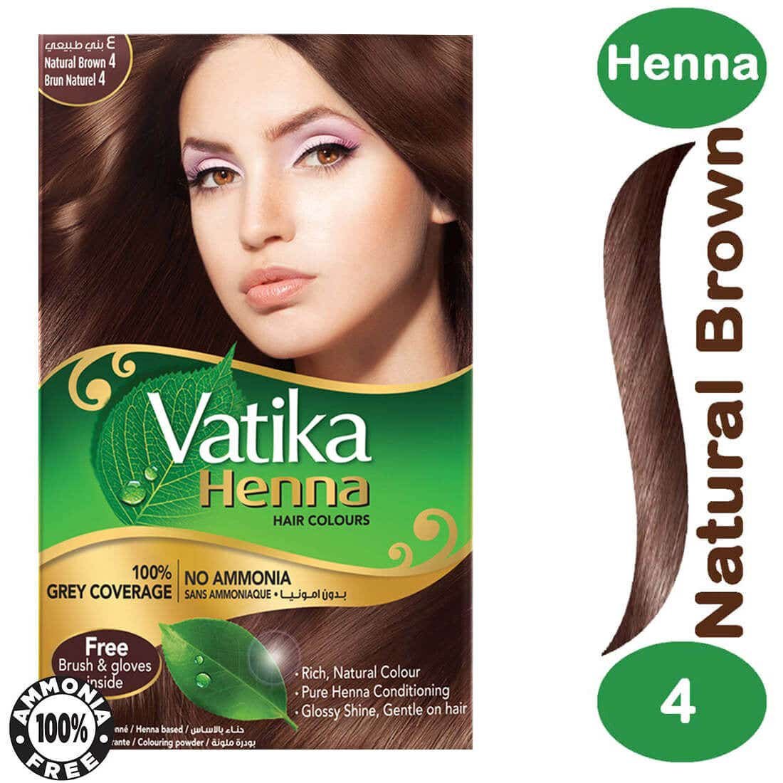 Dabur Vatika Natural Brown Henna hair dye. Nourishes, strengthens, and provides full grey coverage without ammonia.