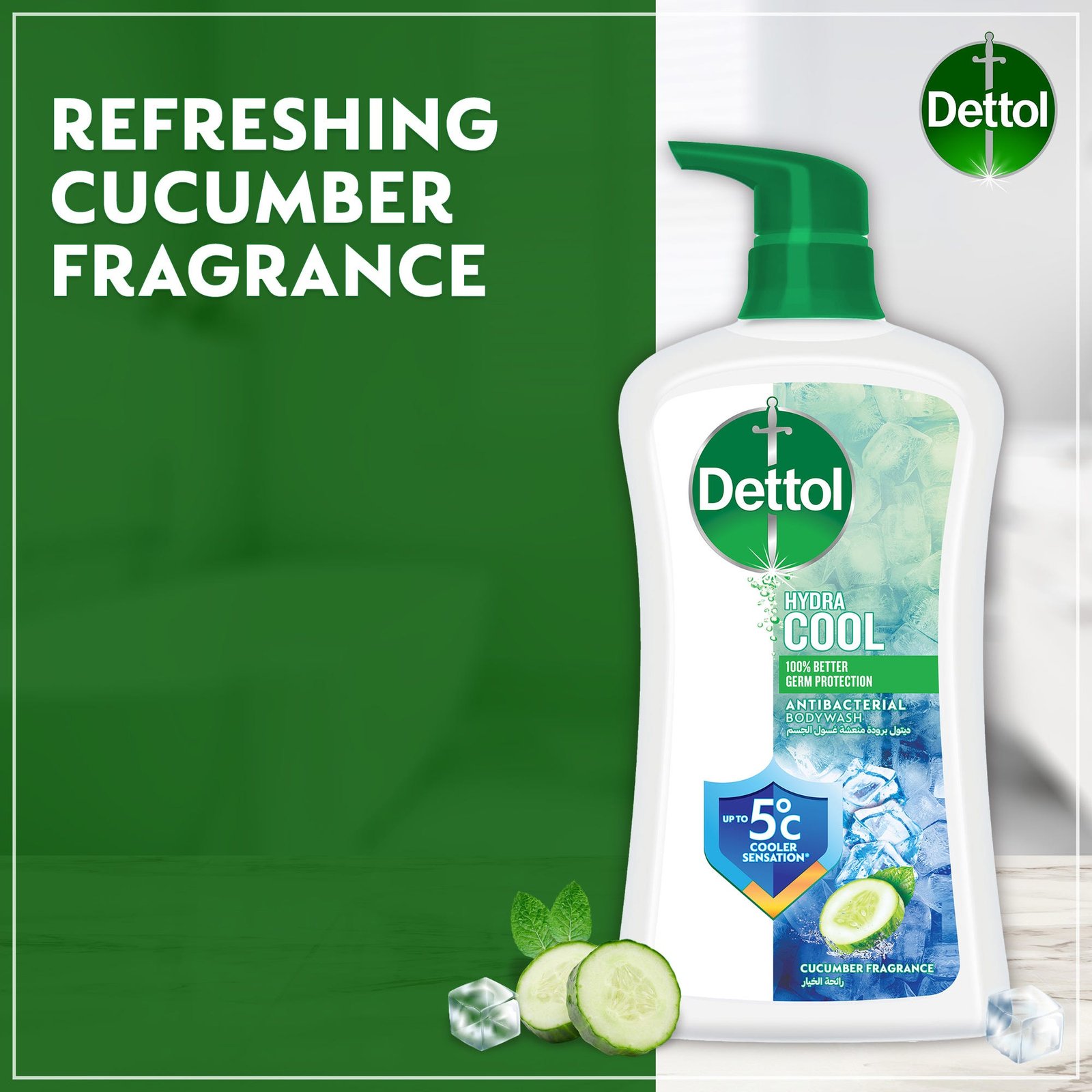 Instant freshness & 100% germ protection with Dettol Hydra Cool Shower Gel in Cucumber & Icy Menthol.