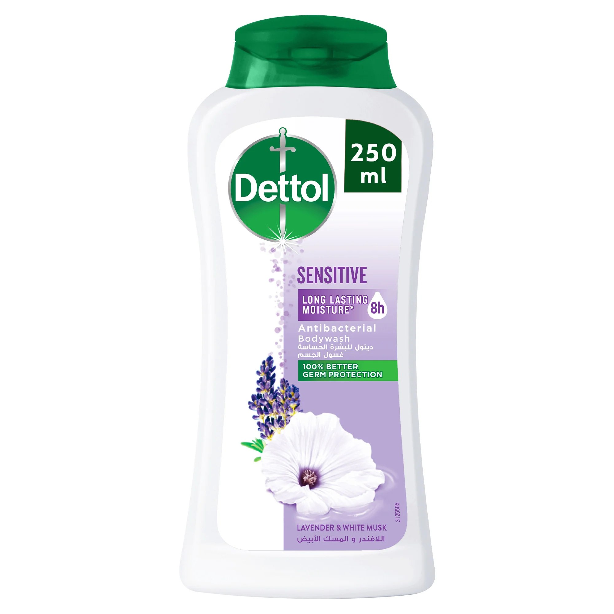 Dettol Sensitive Shower Gel 250 ml: 100% germ protection, 8-hr moisture, lavender & musk scent. Gentle & dermatologically tested.
