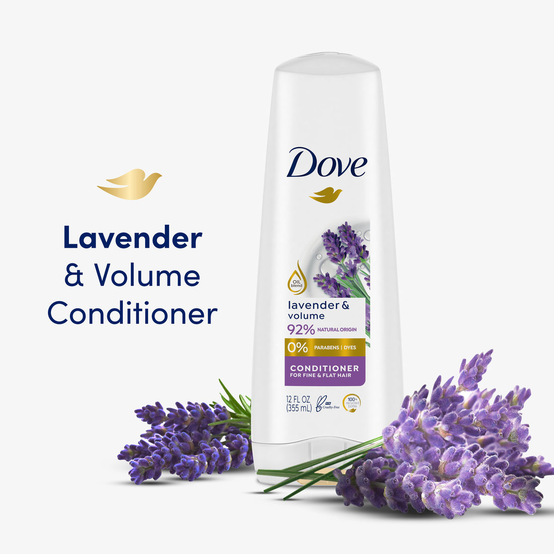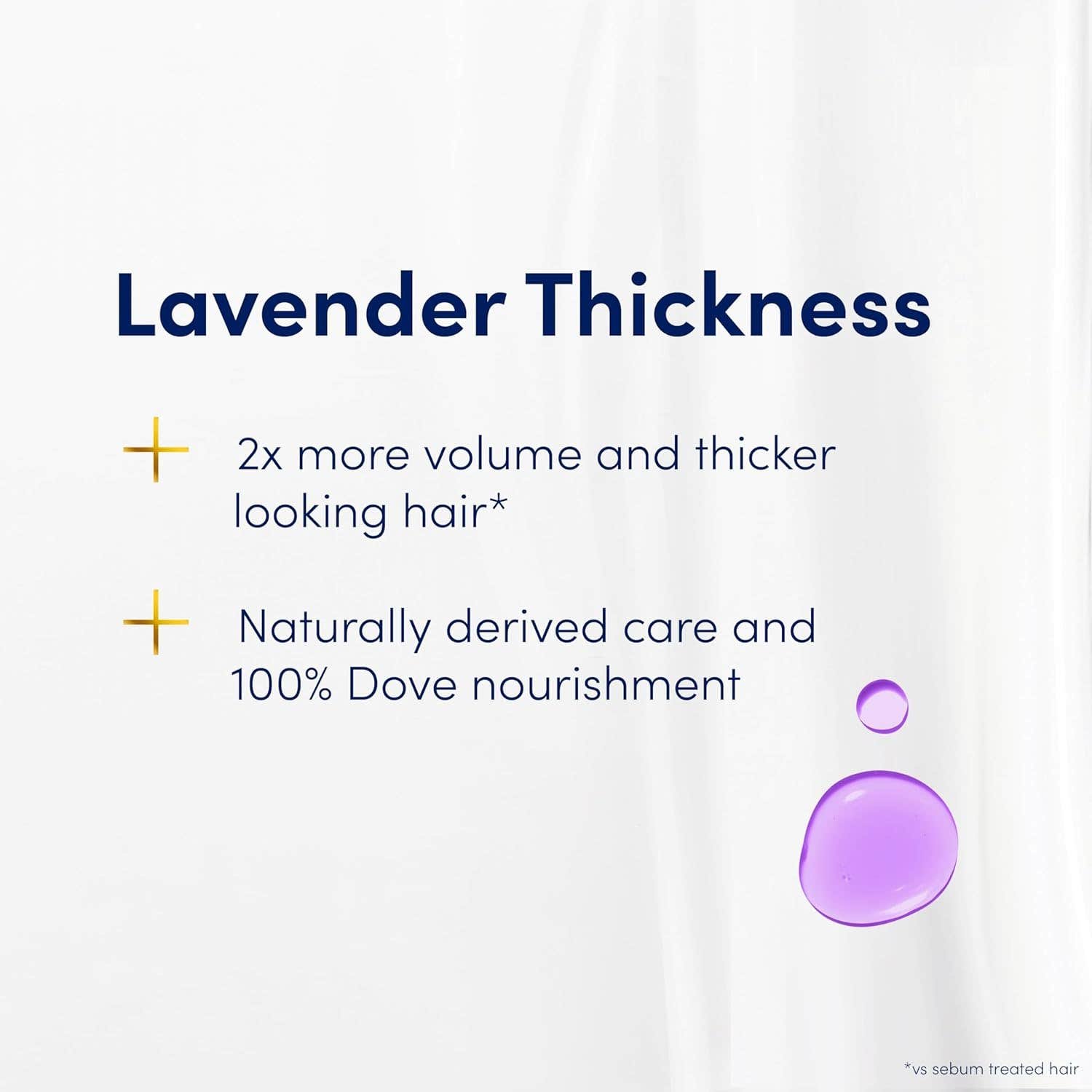 Dove Lavender Thickness Conditioner for enhanced volume and softness. Nourishes, strengthens, and improves manageability.