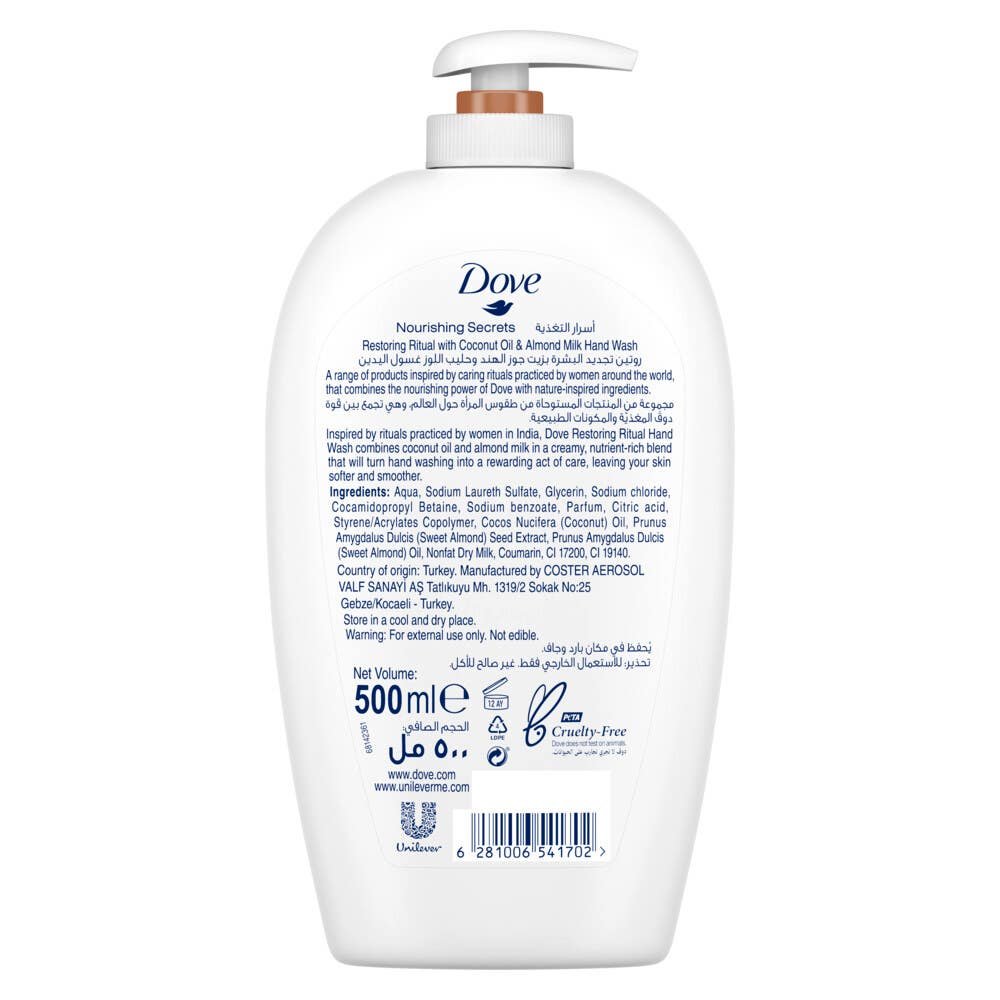 Dove Restoring Ritual Hand Wash with Coconut Oil & Almond Milk. Deeply softens & moisturizes. Refreshing scent. 500ml.