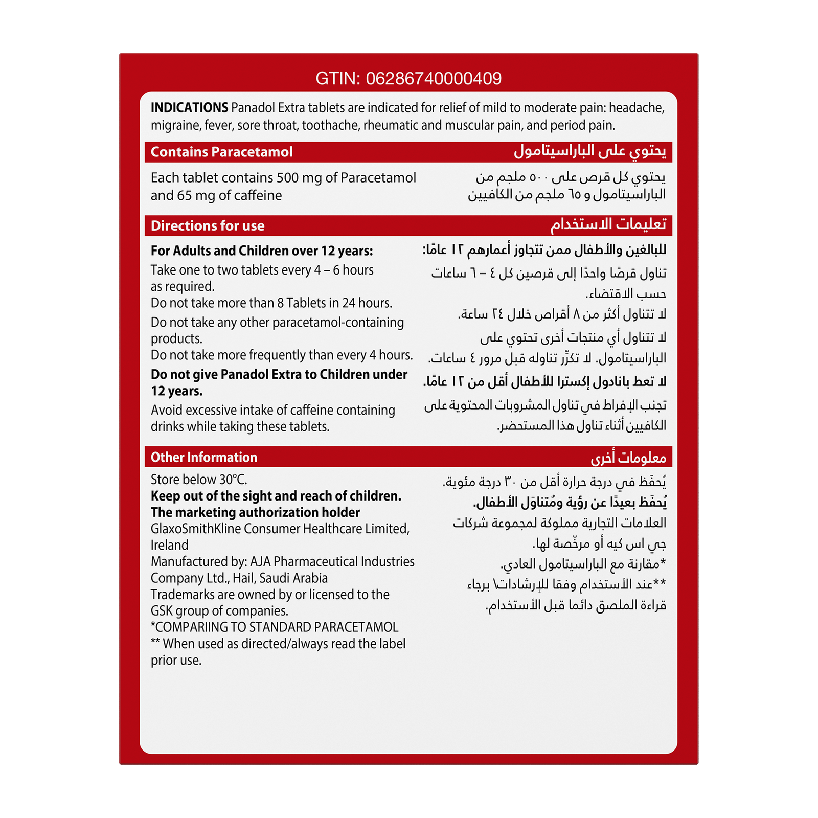 Panadol Extra tablets provide effective relief from mild to moderate pain and fever. The powerful combination of paracetamol and caffeine enhances pain relief. Relieves headaches, muscle aches, menstrual cramps, sore throats, and toothaches. Easy to swallow and effective. Suitable for adults and children over 12 years old. Gentle on the stomach when used as directed.