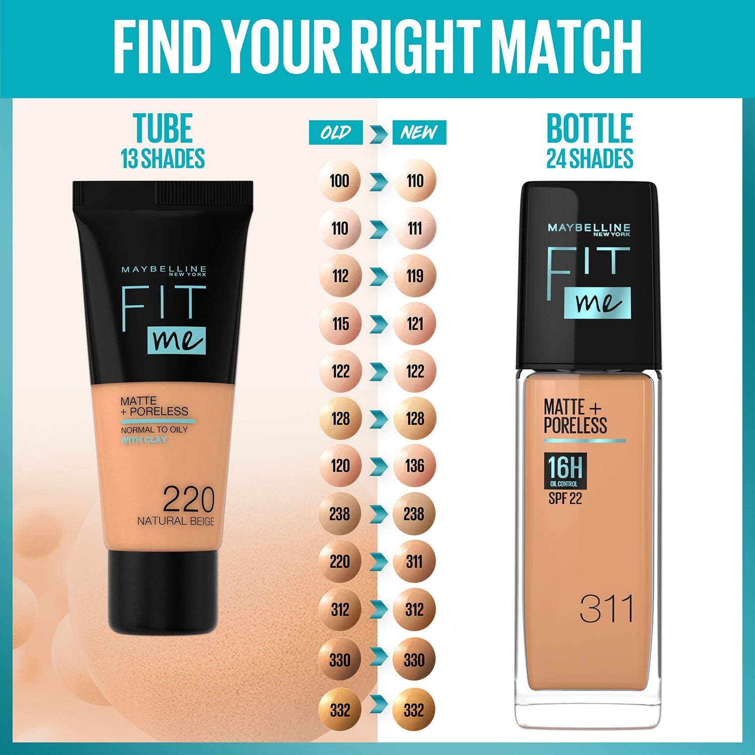 Maybelline Fit Me Matte & Poreless: 16hr oil control, natural matte finish, pore blurring. Perfect for normal to oily skin.