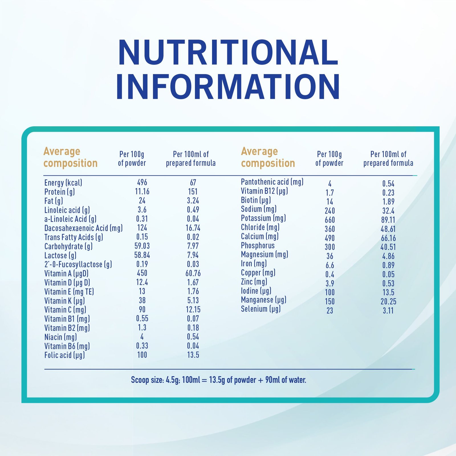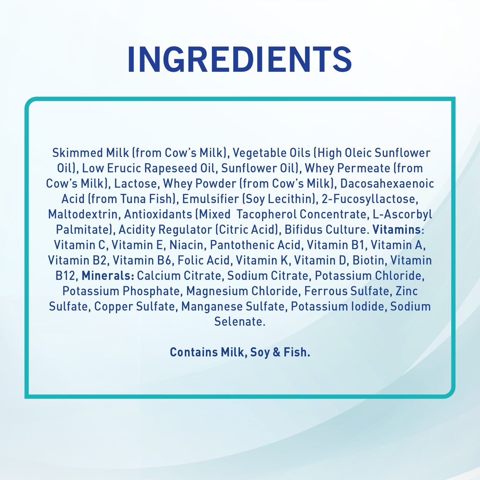 Rapeseed Oil, Sunflower Oil), Whey Permeate (from Cow’s Milk), Lactose, Whey Powder (from Cow’s Milk), Docosahexaenoic Acid (From Tuna Fish), Emulsifier (Soy Lecithin), 2’-Fucosyllactose, Maltodextrin, Antioxidants (Mixed Tocopherol Concentrate, L-Ascorbyl Palmitate), Acidity Regulator (Citric Acid), Bifidus Culture.