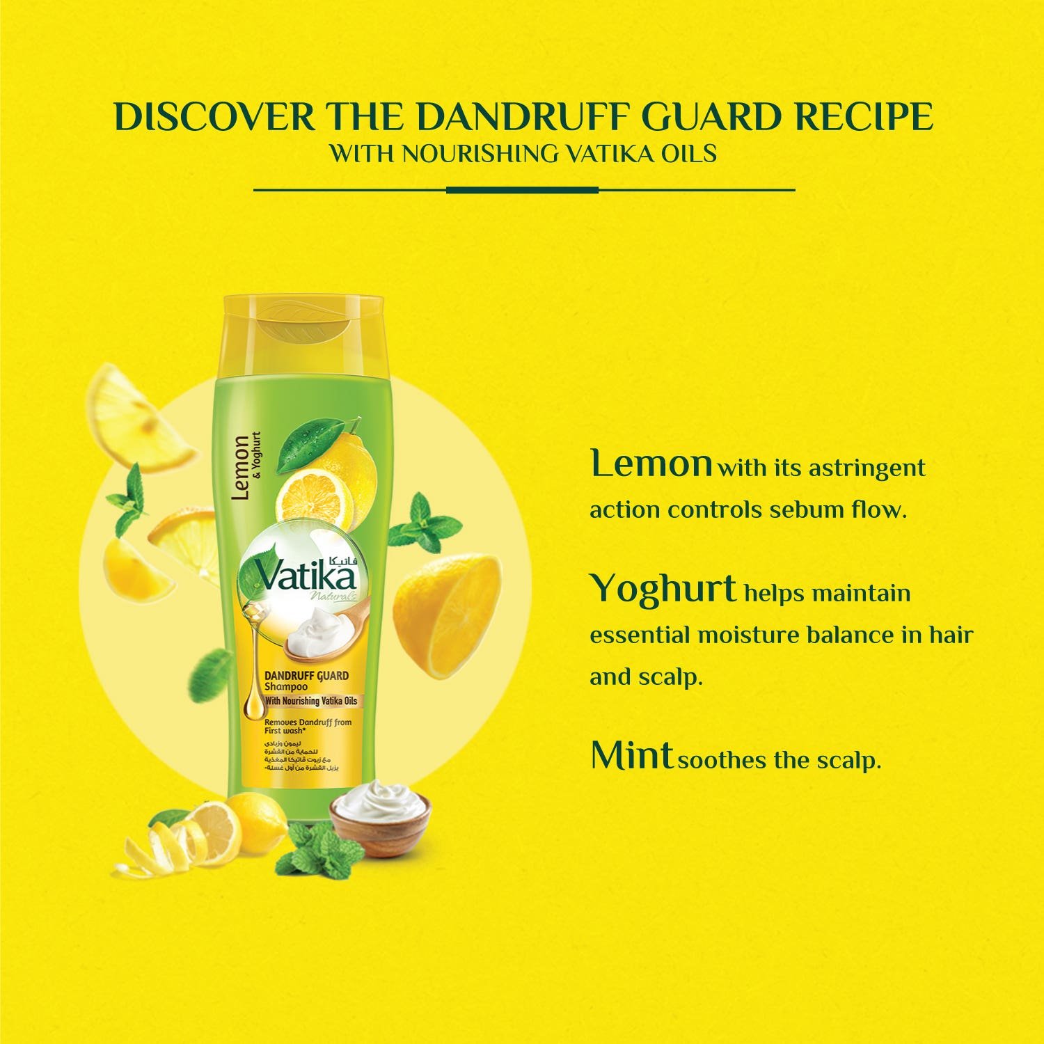وداعاً للقشرة مع شامبو دابر فاتيكا ضد القشرة. تركيبة الليمون والزبادي والنعناع للشعر صحي ومنتعش.