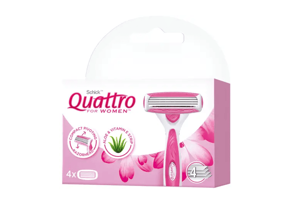 اكتشفي نعومة لا مثيل لها مع شيك كواترو 4 ماكينة حلاقة نسائية للبشرة الحساسة. 4 شفرات مطلية بالألماس لتجربة حلاقة قريبة، ناعمة، وخالية من التهيج. مثالية لبشرتك الرقيقة.