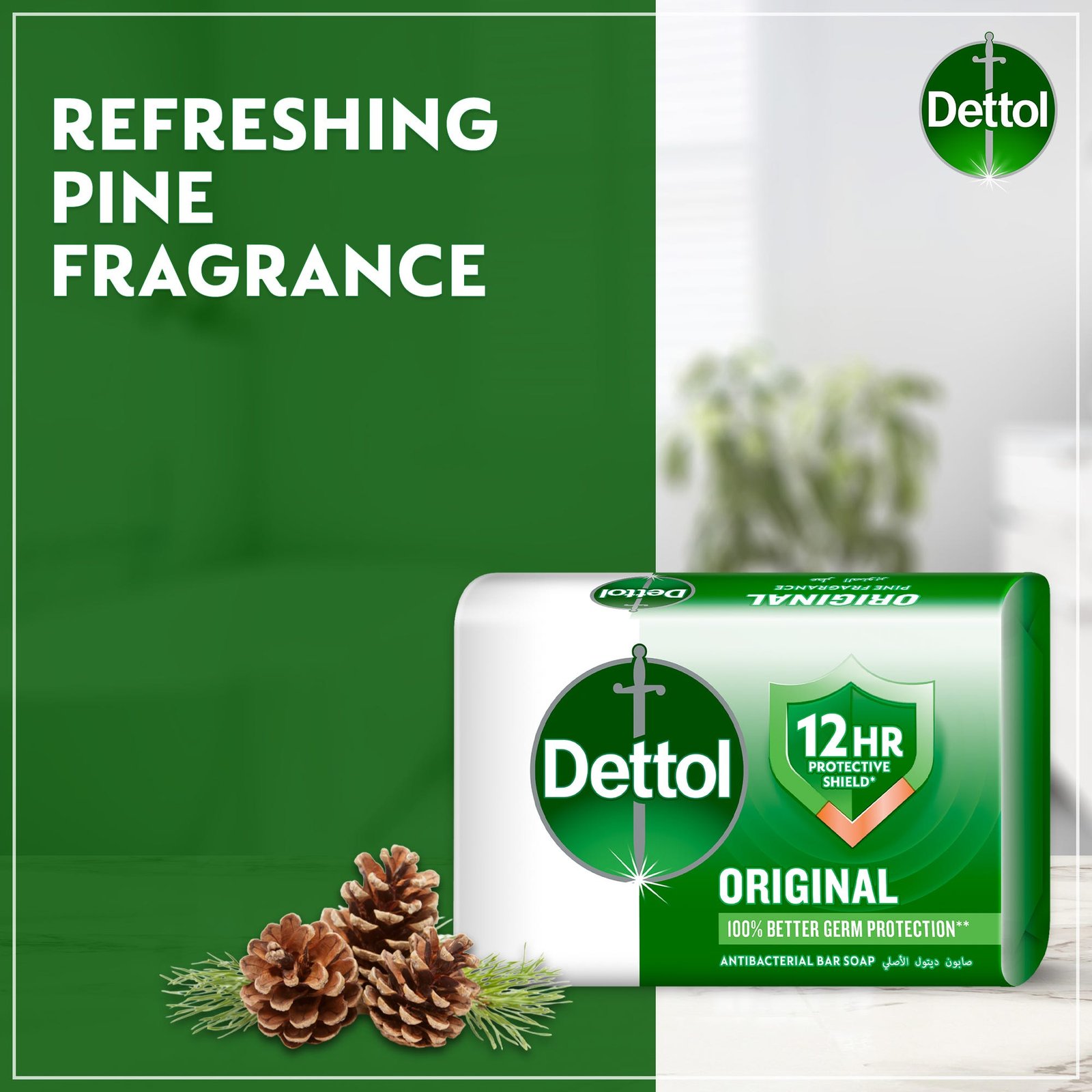 حماية 100% من الجراثيم مع ديتول صابونة الاستحمام الأصلية برائحة الصنوبر. بشرة صحية ومنتعشة برائحة الصنوبر الفواحة.