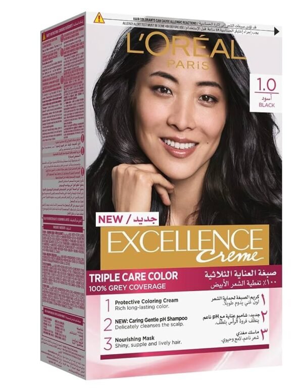 لوريال اكسلانس صبغة شعر أسود طبيعي 1.0: لون أسود طبيعي غني، تغطية كاملة للشيب، وحماية ثلاثية للشعر. احصلي على شعر قوي، لامع، وصحي يدوم طويلاً. تجربة تلوين منزلية احترافية.